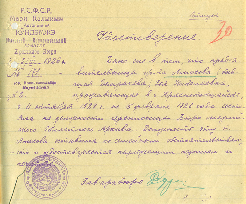 Согласно положению «Об организации Единого государственного архивного фонда РСФСР», утвержденного коллегией Центрахива РСФСР от 3 февраля 1925 года, все документальные материалы Единого государственного архивного фонда РСФСР были разделены на Исторический архив и архив Октябрьской революции, причем датой разделения являлся февраль-март 1917 года. Проведение общих директив Центрархива РСФСР не всегда реализовывалось на местах ввиду множества причин: малочисленности штата сотрудников, отсутствия должного финансирования, неимения надлежащих помещений с необходимым оборудованием. Несмотря на затруднительные условия работы, было произведено распределение всех архивных документов на фонды дореволюционного и послереволюционного периодов, первые из которых образовали Исторический архив, а документальные источники послереволюционного периода были сконцентрированы в архиве Октябрьской революции. В свою очередь документальные первоисточники вышеуказанных ведущих архивных учреждений по содержанию были разделены на 4 секции: народного хозяйства, политики и права, армии и флота, культуры и быта. Такое деление было проведено как в центре, так и на местах. Повсеместно деятельность архивных учреждений заключалась не только в собирании, разборе, упорядочении и систематизации архивных материалов, но и использовании их в интересах государства, общества и граждан. Одной из важнейших функций Мароблархбюро являлась выдача справок населению области «по судебным, воинским, народному образованию, пенсионным вопросам». Эта работа выполнялась постоянно и ее незначительные показатели приводились в отчетах. Известно, что за период с 1 октября 1924 года по 1 октября 1925 года было выдано 29 справок, а за период с 7 декабря 1926 года по 24 сентября 1927 года количество выданных справок доходило до 101. Причем, количество справок, выданных частным лицам превышало над количеством справок, выданных учреждениям и организациям. Так, например, в 1925-1926 годах архивным бюро Марийской области было выдано 27 справок учреждениям и организациям и 580 справок – частным лицам. |