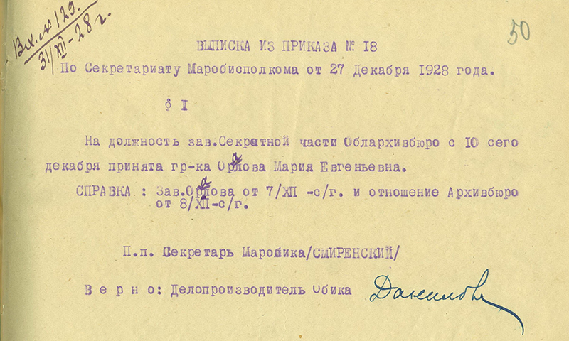 К обязанностям заведующего секретным архивом относились работы по «организации секретного архива и архива Октябрьской революции при Облархбюро». 5 декабря 1928 года Марийское областное архивное бюро обратилось в Йошкар-Олинский городской комитет ВКП(б) с просьбой «выделить партийного товарища, знающего письмоводство и делопроизводство для назначения на должность заведующего секретной частью архивного бюро». Вскоре быстро и оперативно на должность заведующего секретной частью была назначена М.Е. Оралова с 10 декабря 1928 года. Важно отметить, что штат Мароблархбюро на декабрь 1928 года состоял из 5 человек: заведующий В.Я. Родионов, архивариус П.П. Смирнов, научный сотрудник П.П. Иванов, заведующий секретным архивом М.Е. Оралова и сторож-курьер М.Ф. Чекулаева. С утверждением новых штатных единиц научного сотрудника и заведующего секретным архивом была организована коллегия Марийского областного архивного бюро, первое заседание которой состоялось 14 декабря 1928 года. |